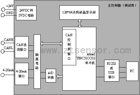 為驗證智能薄膜壓力變送器的功能及性能指標,必須設計一主控制器和多個變送器進行單向(必要時增加雙向)CAN總線通訊,并將4-20mA模擬量轉換為數(shù)字量,將每個變送器節(jié)點的壓力值顯示出來。這個主控制器必須具備CAN總線通信、模數(shù)轉換、壓力值顯示、能與PC通信等功能。為方便現(xiàn)場調(diào)試,這個控制器必須體積小、攜帶方便的特點。