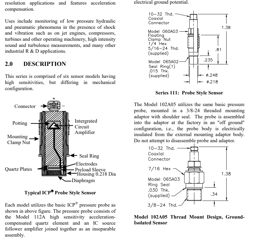 The series of miniature pressure sensors described by this operating guide is designed for low pressure, high resolution applications and features acceleration compensation.Uses include monitoring of low pressure hydraulic and pneumatic phenomena in the presence of shock and vibration such as on jet engines, compressors, turbines and other operating achinery, high intensity sound and turbulence measurements, and many other industrial R & D applications.