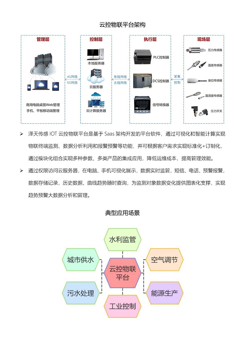 湖南澤天傳感推出新一代智能傳感測(cè)控技術(shù)--云控物聯(lián)解決方案,澤天傳感 IOT 云控物聯(lián)平臺(tái)是基于 Saas 架構(gòu)開發(fā)的平臺(tái)軟件,通過可視化和智能計(jì)算實(shí)現(xiàn)物聯(lián)終端監(jiān)測(cè)、數(shù)據(jù)分析利用和報(bào)警預(yù)警等功能,并可根據(jù)客戶需求實(shí)現(xiàn)標(biāo)準(zhǔn)化+訂制化,通過模塊化組合實(shí)現(xiàn)多種參數(shù)、多類產(chǎn)品的集成應(yīng)用,降低運(yùn)維成本,提高管理效能。通過權(quán)限訪問云服務(wù)器,在電腦、手機(jī)可視化展示,數(shù)據(jù)實(shí)時(shí)監(jiān)管,短信、電話、預(yù)警報(bào)警,數(shù)據(jù)存儲(chǔ)記錄,歷史數(shù)據(jù)、曲線趨勢(shì)隨時(shí)查詢,為監(jiān)測(cè)對(duì)象數(shù)據(jù)變化提供圖表化支撐,實(shí)現(xiàn)趨勢(shì)預(yù)警大數(shù)據(jù)分析和管理。