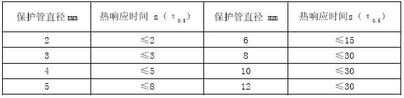 在溫度階躍變化時,溫度傳感器的輸出變化至量程變化的50%所需要的時間稱為熱響應(yīng)時間,用τ0.5表示。影響τ0.5的因素與保護(hù)管材料、直徑、壁厚有關(guān),而且還與其結(jié)構(gòu)形式、安裝方法、置入深度以及被測介質(zhì)的流速、種類有關(guān)。下表為不同直徑保護(hù)管的熱響應(yīng)時間(材質(zhì)為不銹鋼,水流速度為1m/s,測試數(shù)據(jù)為參考值)