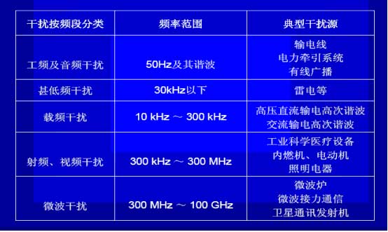 電磁干擾的產(chǎn)生包括發(fā)射源產(chǎn)生干擾噪聲的原因和接收源感受干擾噪聲的原因,發(fā)射源產(chǎn)生干擾噪聲的原因有:發(fā)射源的隱性頻率;發(fā)射源對接收源所產(chǎn)生的混附波與調(diào)幅干擾;發(fā)射源的不當(dāng)調(diào)幅調(diào)變輸出;接收機本地振蕩噪聲;時鐘信號傳送的衍生噪聲;電機裝置如馬達(dá)繼電器;電力系統(tǒng)如火花電暈噪聲;閃電雷擊。接收源感受干擾噪聲的原因有:接收源射頻頻率選用不當(dāng)造成噪聲滲入干擾;混附波與調(diào)幅干擾;電源線噪聲耦合至接收源造成干擾;電子盒箱柜隔離不佳滲入接收源造成干擾。電磁干擾的頻段劃分如下圖: